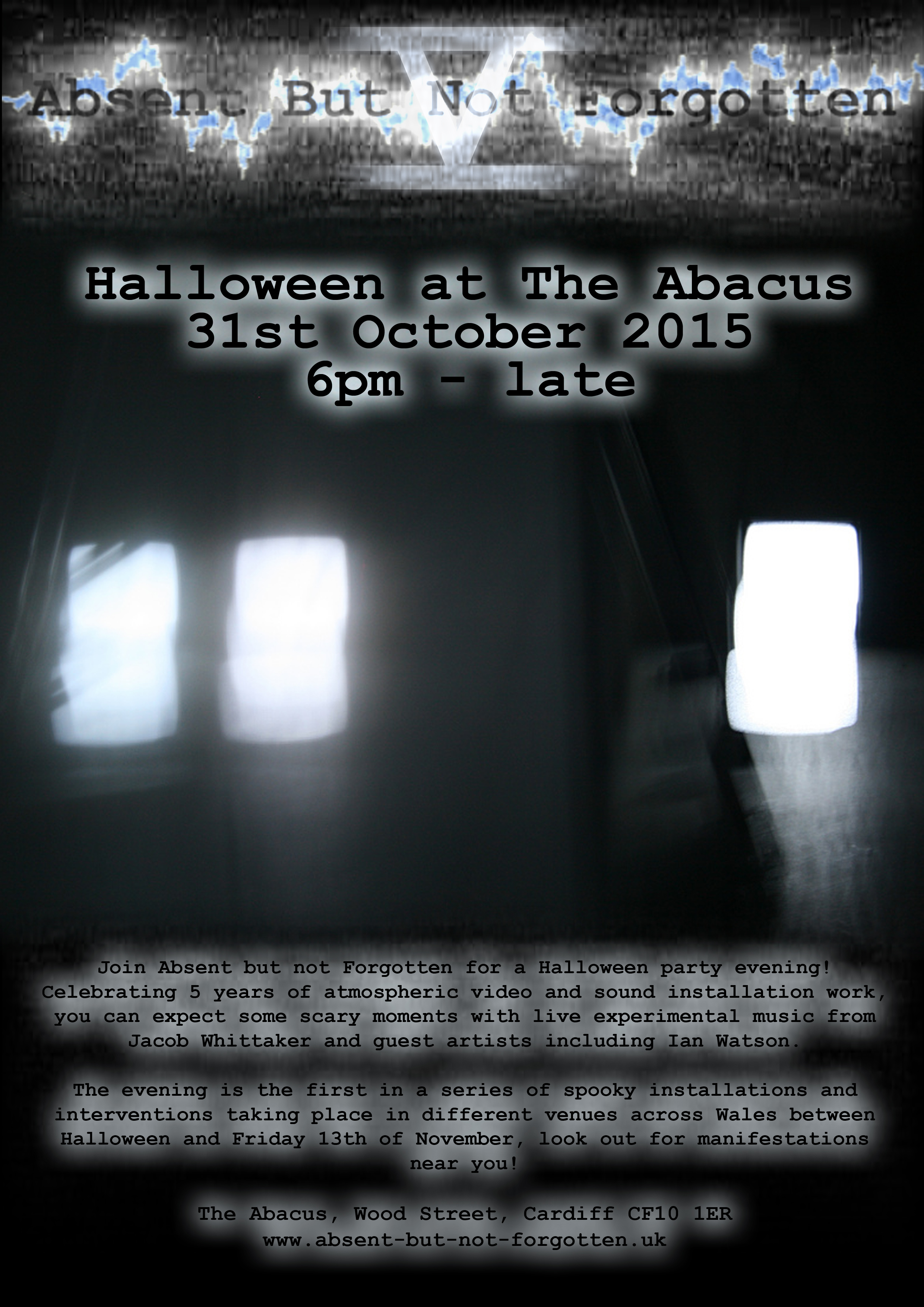 Join Absent But Not Forgotten for a Halloween party evening! Celebrating 5 years of atmospheric video and sound installation work, you can expect some scary moments with live experimental music from Jacob Whittaker and guest artists including Ian Watson.
