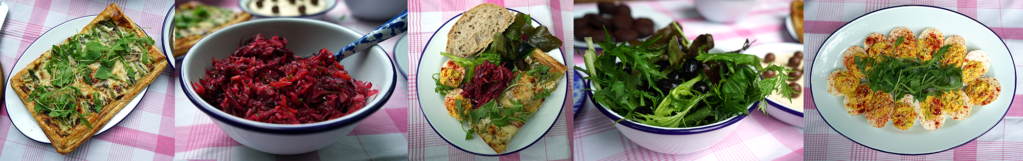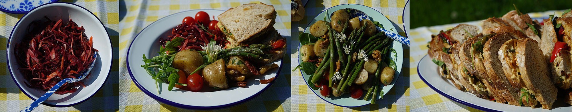 For our picnic feast of 13 this week we enjoyed a 13 ingredient Potato Salad (13 Salad Potatoes, 13 Baby Plum Tomatoes, 13 Asparagus spears, Sun Dried Tomatoes and Toasted Walnuts with a dressing of Olive Oil, Lemon Juice, Brown Sugar, Black Pepper, Salt, served on a bed of Rocket and Spinach and garnished with Wild Garlic Flowers); A 13 ingredient Beetroot slaw (Beetroot, Red cabbage, White cabbage, Fennel, Celery, Apple, Carrot, Tomato puree, Olive Oil, Black Olives, Lemon Juice, Mint, Black Pepper); 13 hummus & roast veg sandwiches with 13 ingredients (hummus made from Chickpeas, Tahini, Lemon Juice, Olive Oil, Salt and Smoked paprika served on Brown Sourdough Bread with Wild Rocket, Roasted Red, Green and Yellow Peppers and Roasted Courgette); 13 summer fruit topped mini Victoria sponges with 13 ingredients (Flour, Baking Powder, Butter, Eggs, Caster Sugar, Vanilla Essence frosted with Soft cheese, Icing Sugar, Vanilla, Fresh Strawberries, Raspberries and Blueberries and garnished with Mint Leaves).