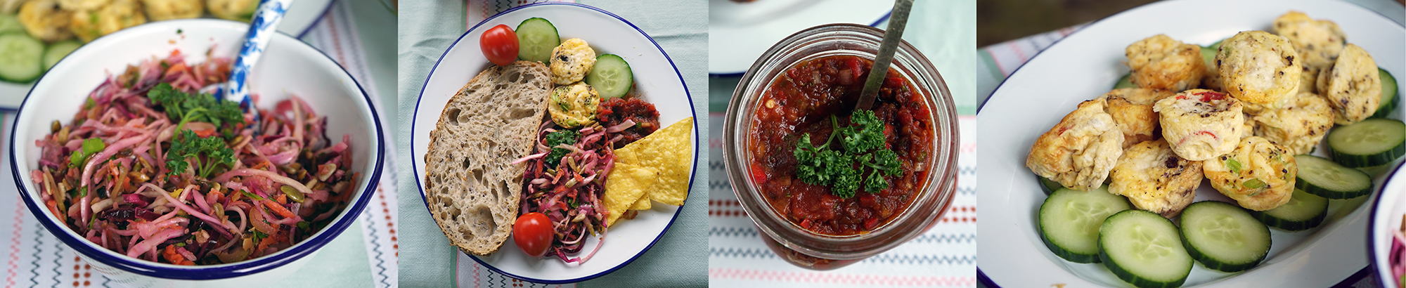 13 Crustless mini quiches flavoured with a selection of 13 ingredients (Spinach, Rocket, Asparagus, Red Chilli, Green Olives, Tomato, Cheddar, Parmesan, Basil, Oregano, Sundried Tomatoes, Spring Onion, Black Pepper) served with 13 slices of cucumber; 13 ingredient smoked chilli salsa (Red onion, Garlic, Green chili, Chipotle chili, Sun dried tomatoes, Red pepper, Lime Juice, Tomatoes, Smoked paprika, Salt, Thyme, Parsley, Sugar) served with tortilla chips; 13 ingredient vegan slaw (White cabbage, Red cabbage, Carrot, Fennel, Celery, Olive oil, Sunflower seeds, Pumpkin seeds, Green Olives, Parsley, Lemon juice, Salt, Pepper); special 13 ingredient Bara Menyn sourdough loaf; 13 baby plum tomatoes on the vine;13 ingredient ginger and walnut loaf with dates and figs (Flour, Baking Powder, Brown Sugar, Ground Ginger, Nutmeg, Cinnamon, Golden Syrup, Butter, Eggs, Milk, Dates, Walnuts, Dried Figs).
