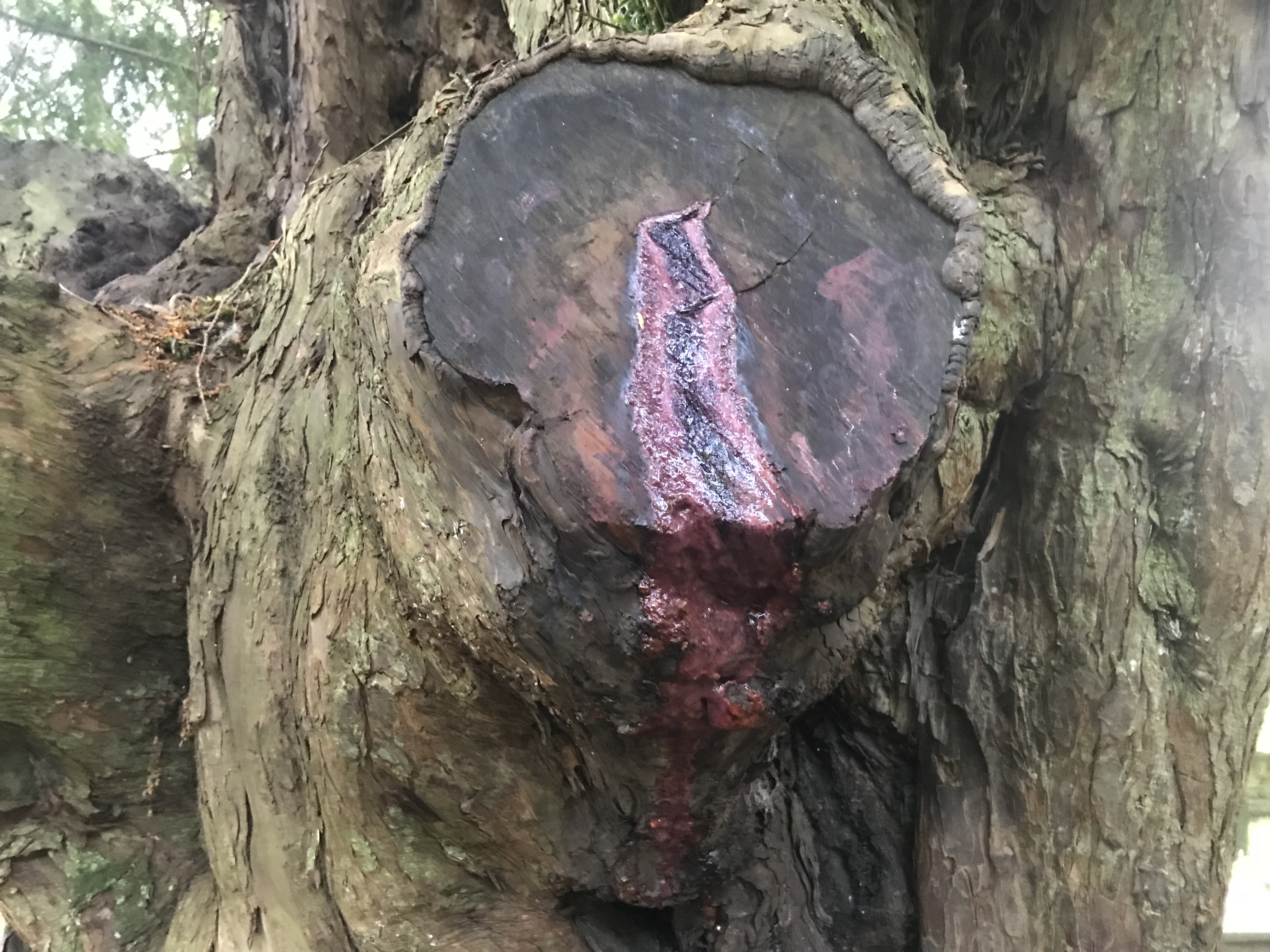 On our way home we visited St Bryach’s, the beautiful old church in Nevern village. One of the ancient (700 year old) Yew trees in the graveyard is called the ‘Bleeding Yew’. It continuously secretes an unusual red sap, an unexplained phenomena which has attracted a number of miraculous legends – the church website wryly favours the idea that it bleeds in sympathy with Jesus on the cross. There is also said to be a white-robed man who wanders in the churchyard as well as the sound of children playing at night.